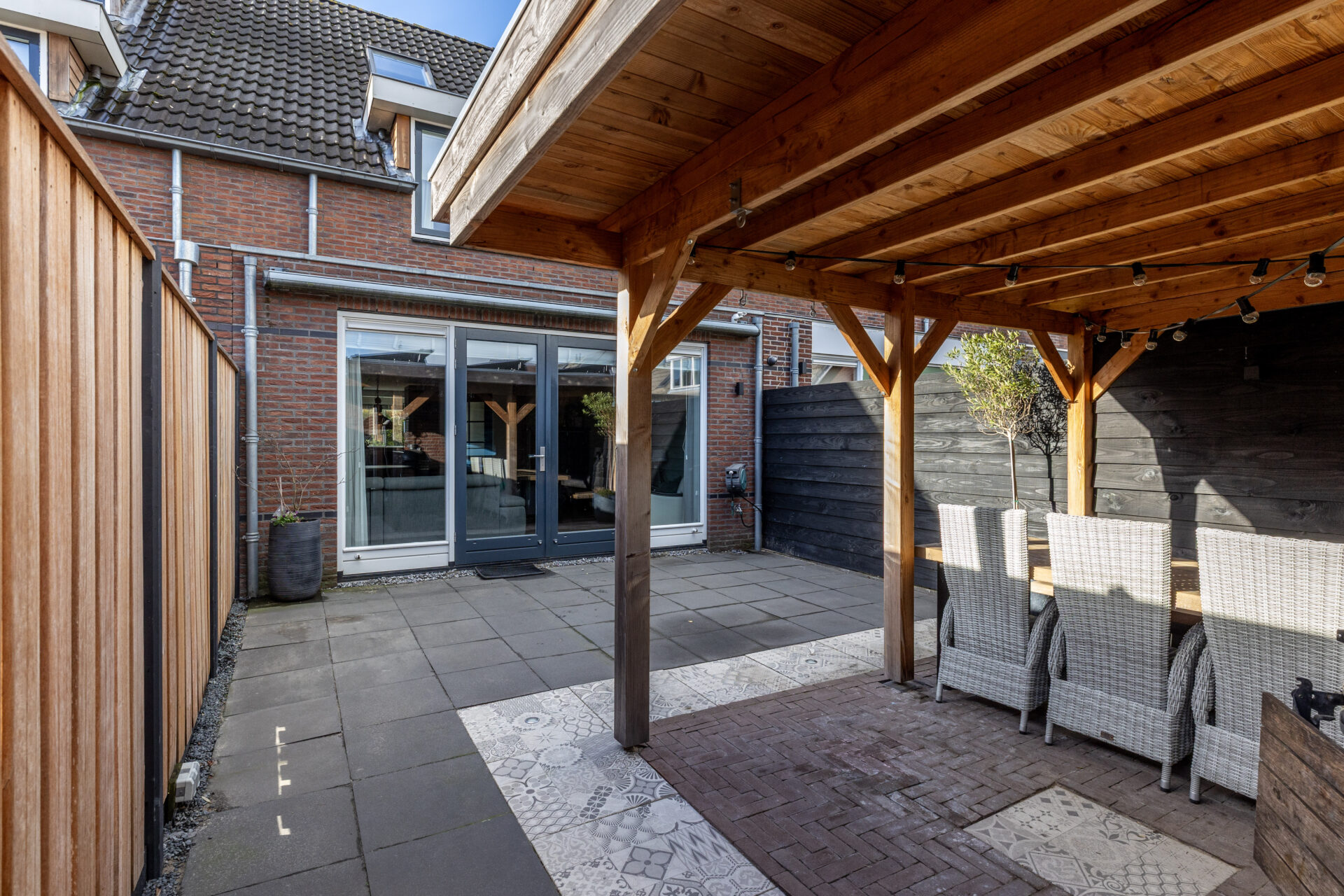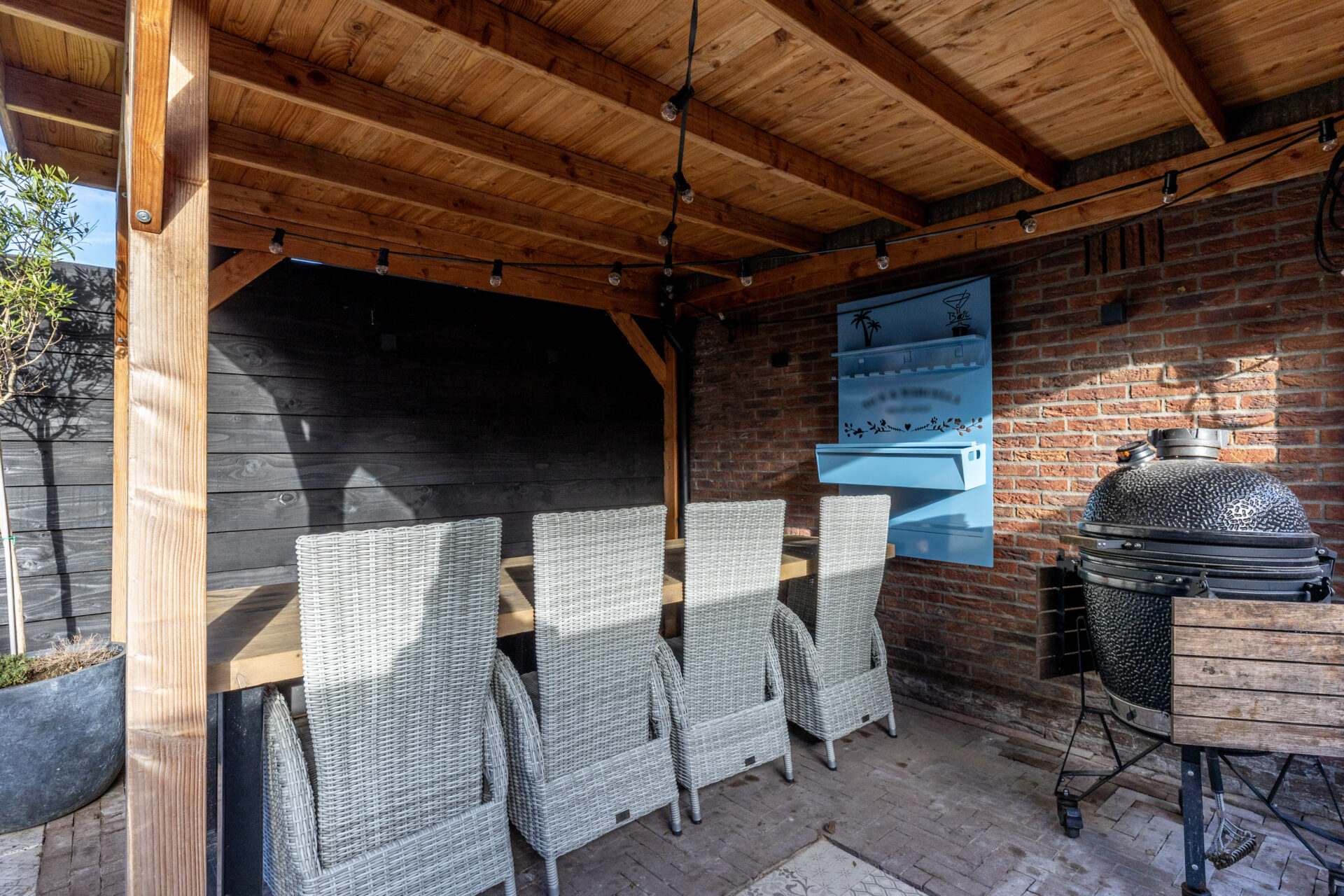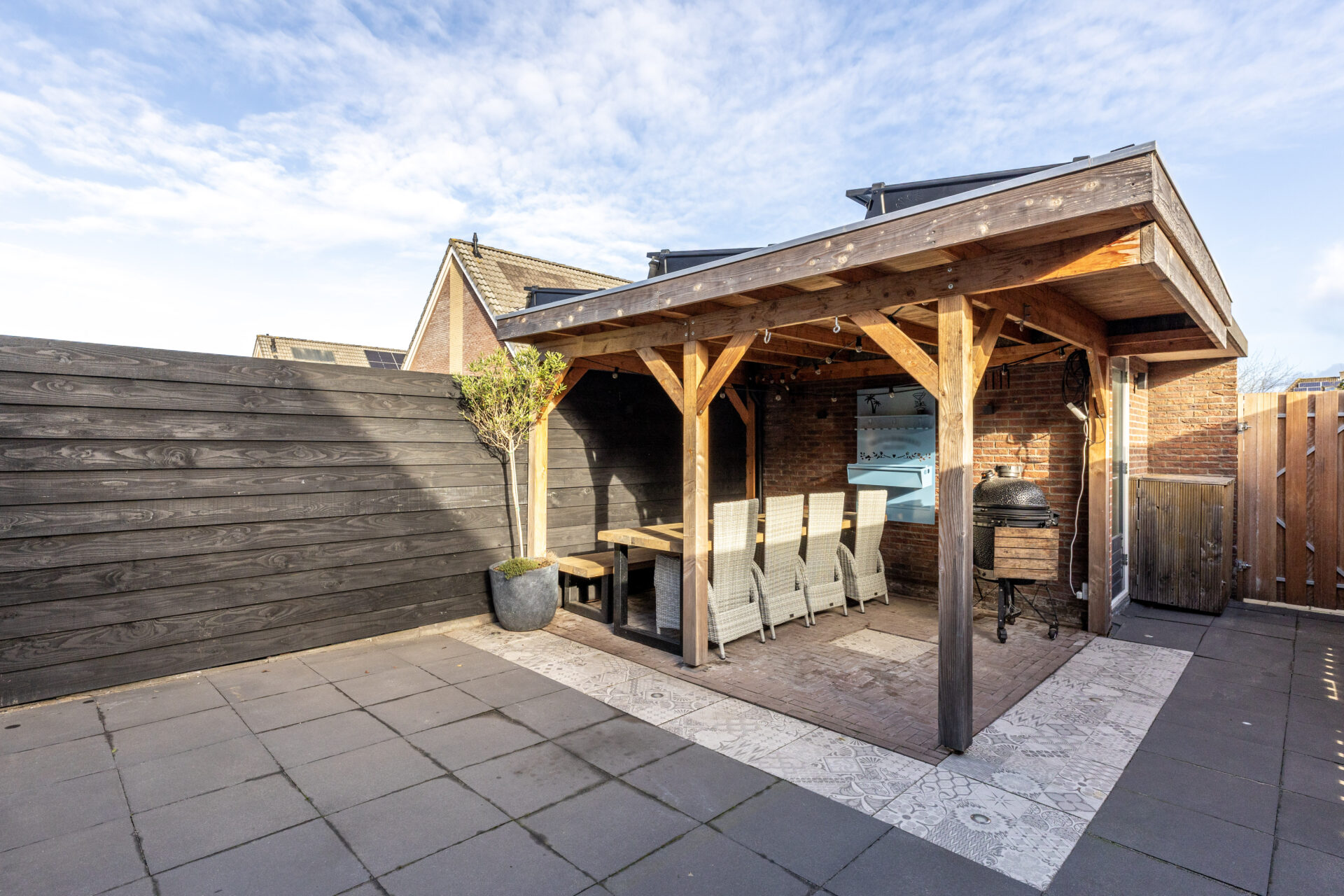 De woning beschikt over een voor- en achtertuin. De voortuin biedt de mogelijkheid voor een zonnig zitje vanwege de zuidwestelijke ligging. De achtertuin is gelegen op het noordoosten en is bereikbaar via de openslaande deuren in de woonkamer én via achterom. In de achtertuin is een ruime berging van circa 7 vierkante meter en een riante overkapping (gebouwd in 2024) gelegen. Het brede uitvalscherm biedt de mogelijkheid om extra schaduwplekken te realiseren.